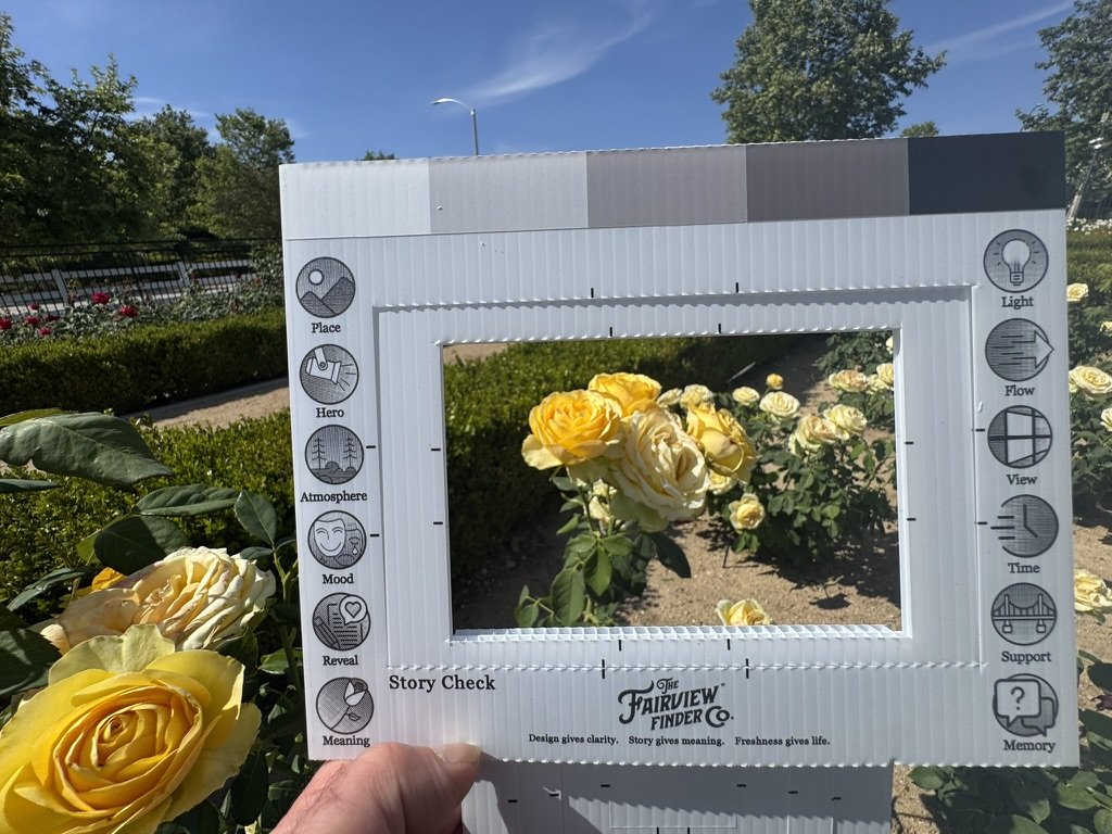 Story Check (back side). Flip the Finder over. The back side walks you through the questions that turn a good composition into a painting with something to say. What drew you here? Where does the eye go first? What can you leave out?